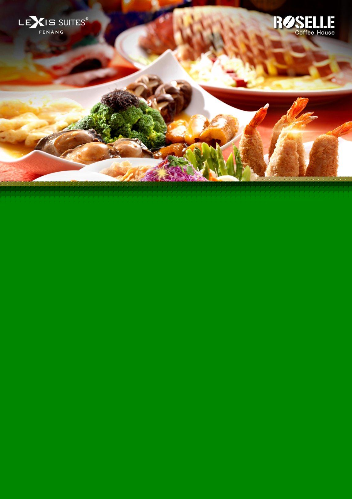 To book the buffet or course dinners, contact Lexis Suites Penang at 04 628 2888 or email reservations@lexissuitespenang.com